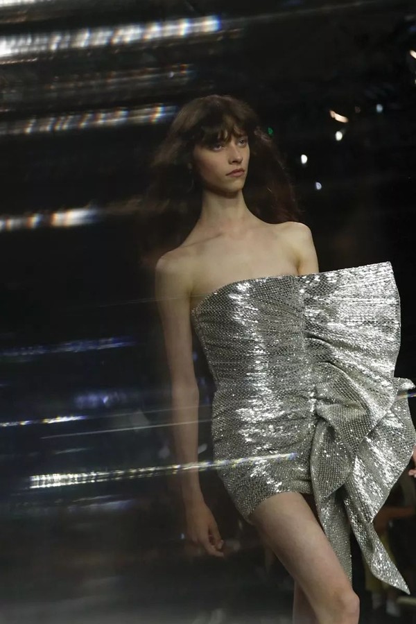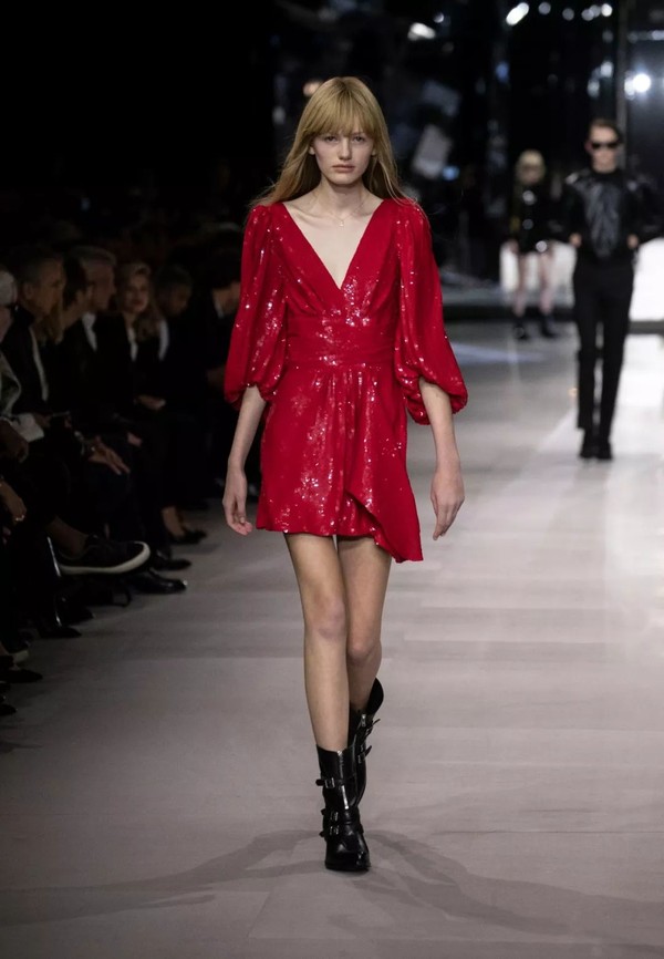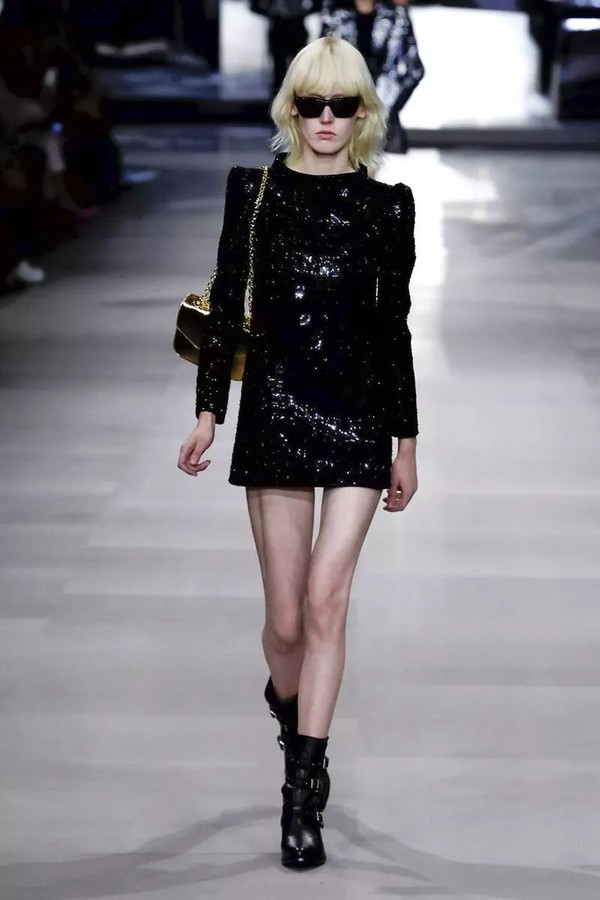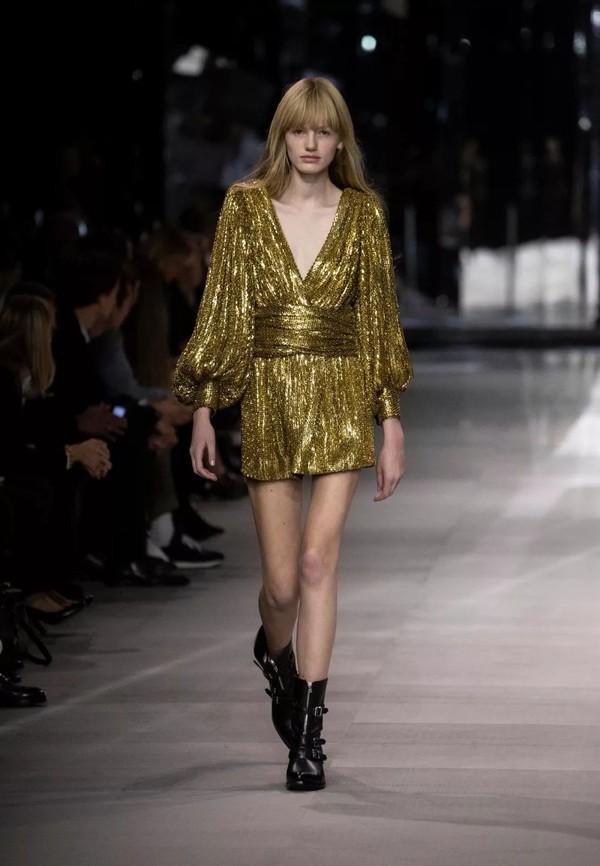 Hedi Slimane将一种强烈的巴黎精神带到了在CELINE的首秀,他出生在这儿,在这所城市的日夜滋养之下成长。巴黎之所以称之为光之城,就是因为它的夜晚比白天还要美丽,Slimane深知这一点,并将此融入在自己的设计语言之中。晚装部分,他展现了四条比迪斯科球还要闪耀的鸡尾酒裙。鲜血般的猩红色、像毒药一样的绿色以及他挚爱的金银二色,在整个系列中就像四颗闪闪发光的恒星。