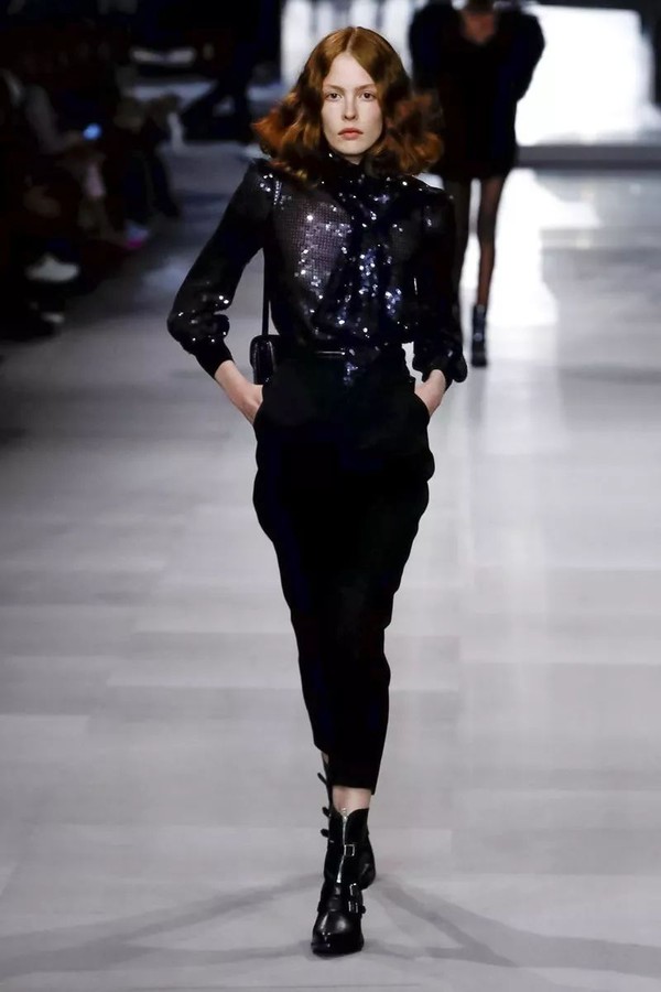 如果你关注Hedi Slimane摄影网站的Instagram账号,便会发现一切都只有黑白二色。黑色在本季依然被放置在足够重要的位置,它被赋予了哑光、绸面、亮片等多重效果。那些黑色西装外套和连身裙就像一道道锋利的剪影,在巴黎夜晚的街道中穿梭。