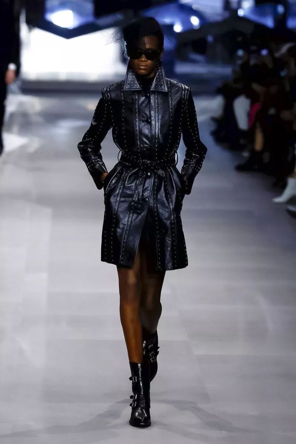 Hedi Slimane来自意大利阿布鲁佐地区的裁缝家庭,对剪裁有种天生的执念。在这个系列中他用三套裙装展现了一种全新的廓形,那些夹克的腰线普遍都高得离奇,肩线又像山峰一般隆起,比八十年代的流行的轮廓还要张扬。与之相配的,是他标志性的短裙,即使在2018年,这些来自上世纪60年代的裙子看起来依然显得激进。