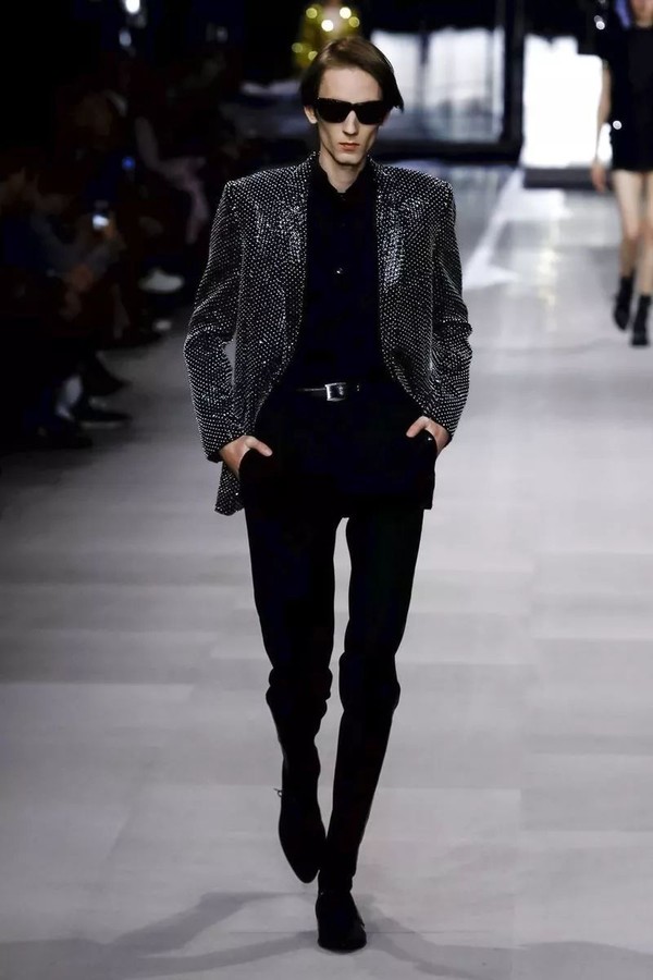 而被Hedi Slimane高度重视的男装部分,他自然交出了漂亮的答案,毕竟这一直是他最擅长的领域。削瘦的剪裁全面回归,在讲究“政治正确”与“多元化审美”的当下,这股风潮显得格外惹眼。其中一些男孩的形象来自于导演Jérôme de Missolz的戏剧作品《Des Jeunes Gens Mödernes》。