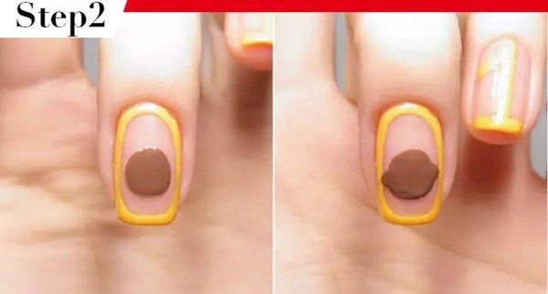 等咖啡色甲油干掉后,用肉色画出小猴子的脸的轮廓!