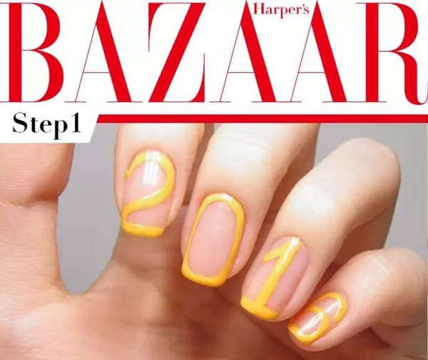 首先,在指甲上涂一层打底的透明亮油,然后用黄色甲油在指甲上写出“2016”!