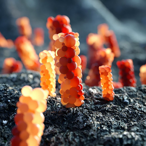 而事实上,这些美丽的小东西真的不能吃。这是来自芝加哥的数字艺术家David Brodeur创作的“天体系列”(Celestial Series)的一部分,为我们呈现了一个奇妙的外星世界,上面充满了浆果植物、发光的水晶、长在地上的糖果形状的球体,怪异而又美丽。
