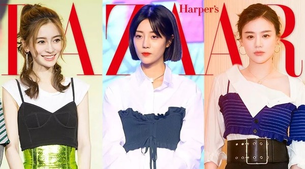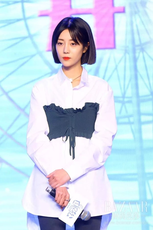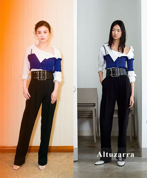总攻力MaX的马思纯同样用针织材质的跟特殊不对称领设计的衬衫叠在一起,加上宽腰封,有了胸以下都是腿的既视感。