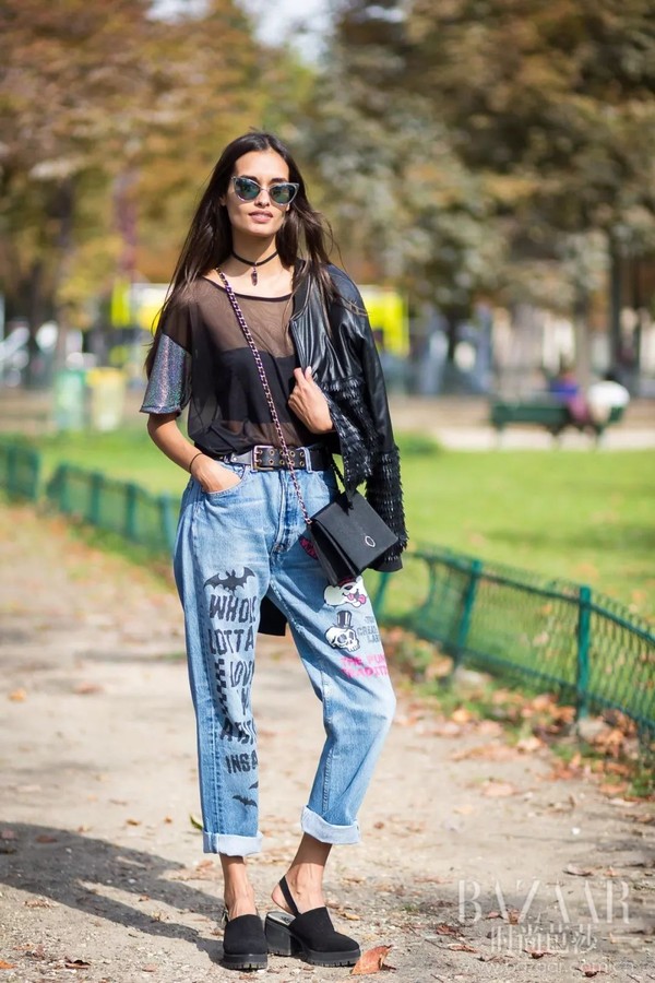天生自带英气的牛仔单品跟透视+内衣也是很搭,宽松的透视装和同样宽松的牛仔在一起就是大写的不羁。