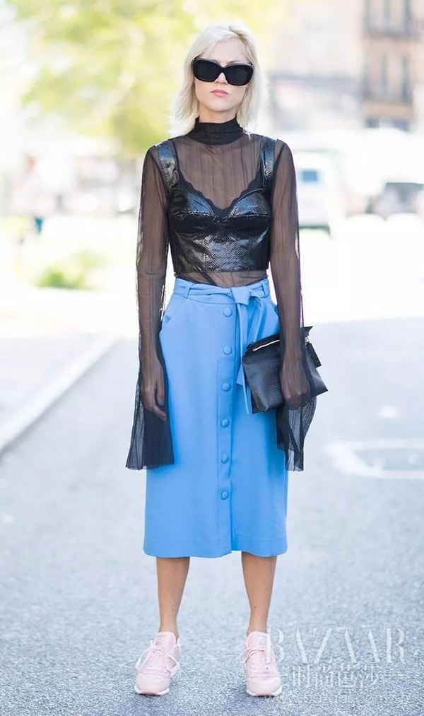 或者,可以从内衣的材质入手,硬朗的皮质不失为一种好选择,跟雪纺碰撞会有酷酷的高级感。