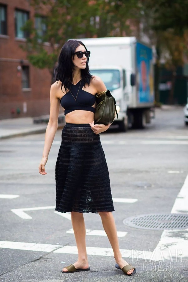 在外穿内衣的选择上,可以考虑跟下装同色系的,上下有了呼应,一看就是时髦精本人了。
