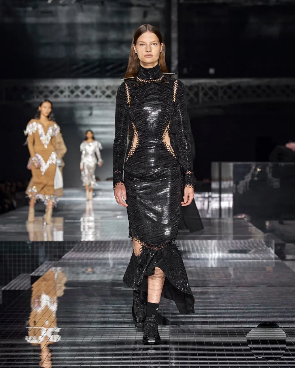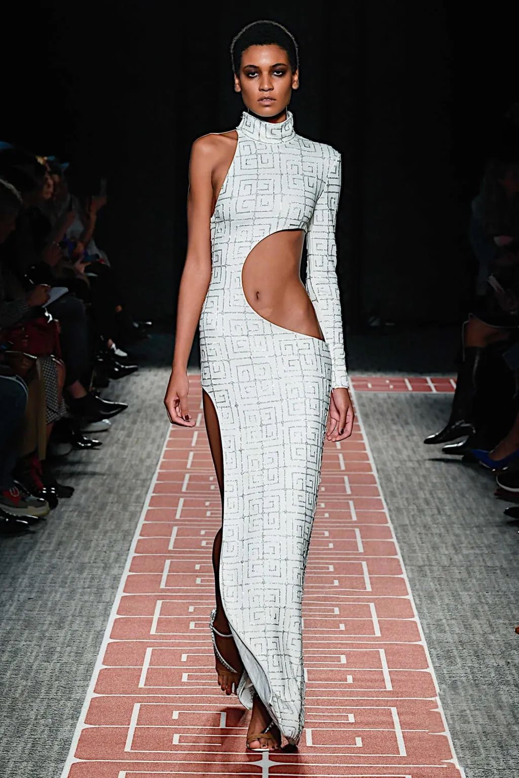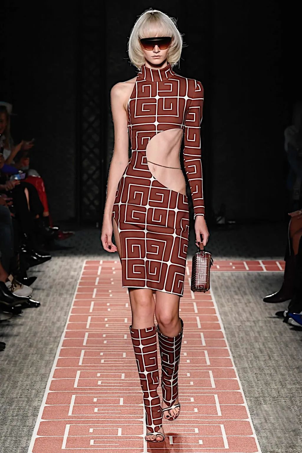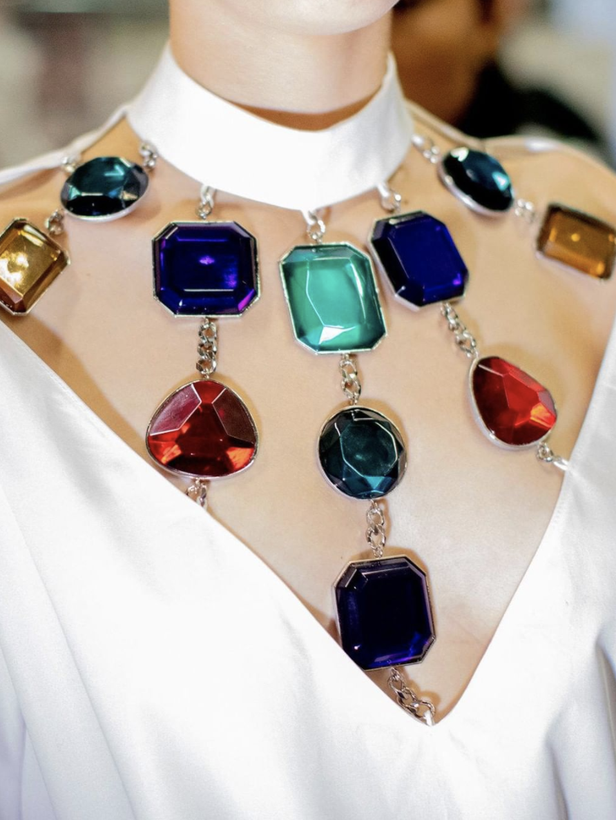 几何镂空廓形被大量运用在成衣裙装中,掺入了现代的光感,浓烈鲜亮不失性感。