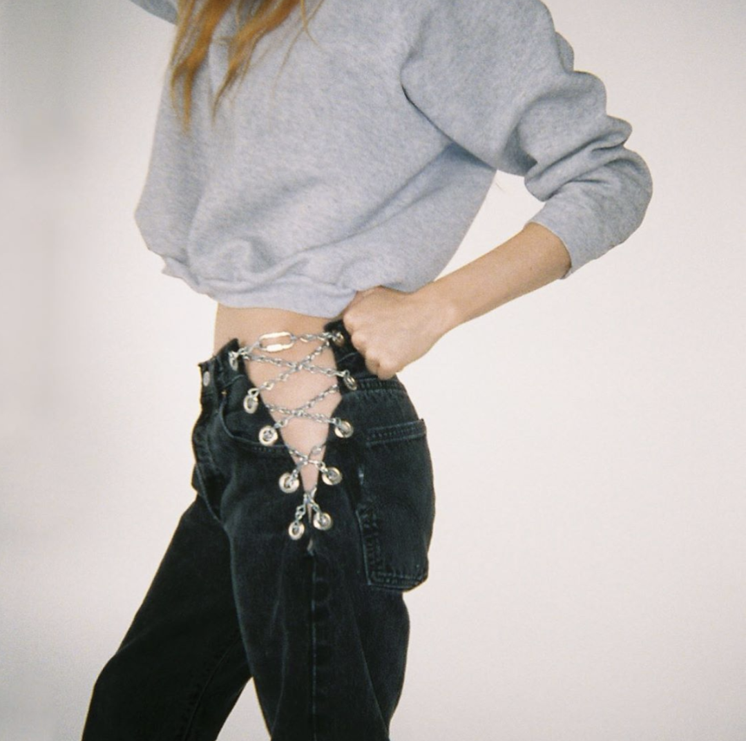 而小众品牌EB Denim在胯部镂空设计这方面也是很有新意,喜欢用链条来和裤子结合,他们家这条经典的裤子,出镜率也是很高。