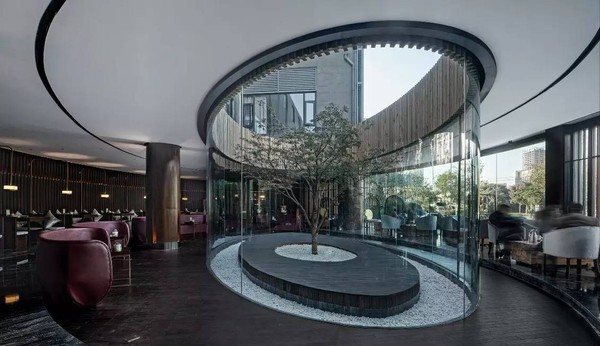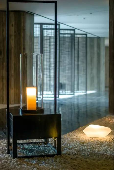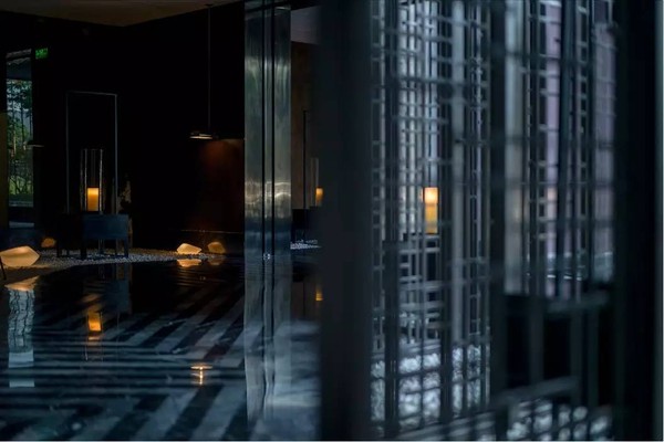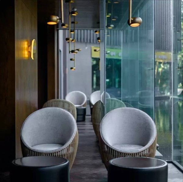 大堂背景采用半通透的表现形式,将户外大片竹林引景入室,给客人营造一种舒适的氛围,静坐在大堂吧落地窗边的沙发上,视线被竹林与水镜的倒影充盈,茶驿中独特的天井设计,为客人提供更多的自然体验,丰富设计的趣味性
