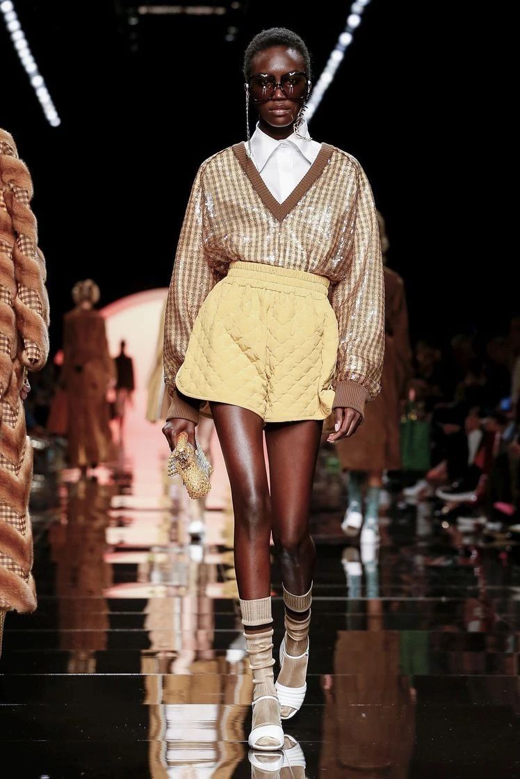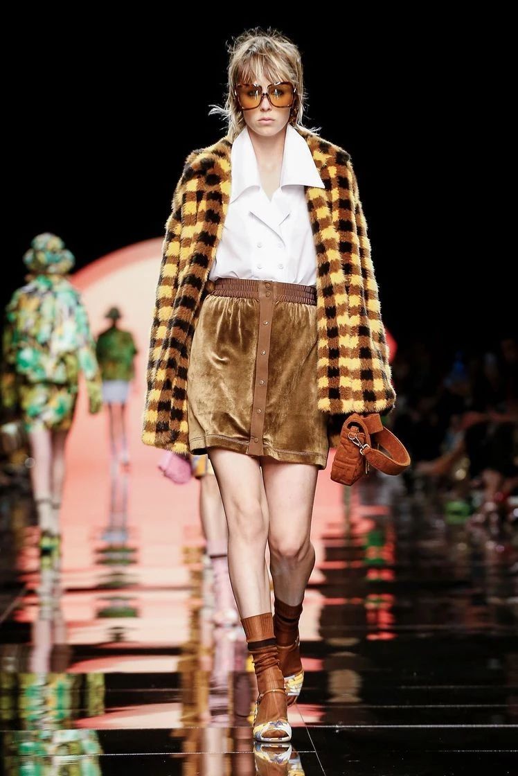 在印花之外,Fendi经典的格纹元素再次回归,自带天然气息的维希格纹出现在皮草外套、夹克、短裤甚至内衬上,混搭着丝绒半裙和尖领衬衫,整体造型复古又有趣。