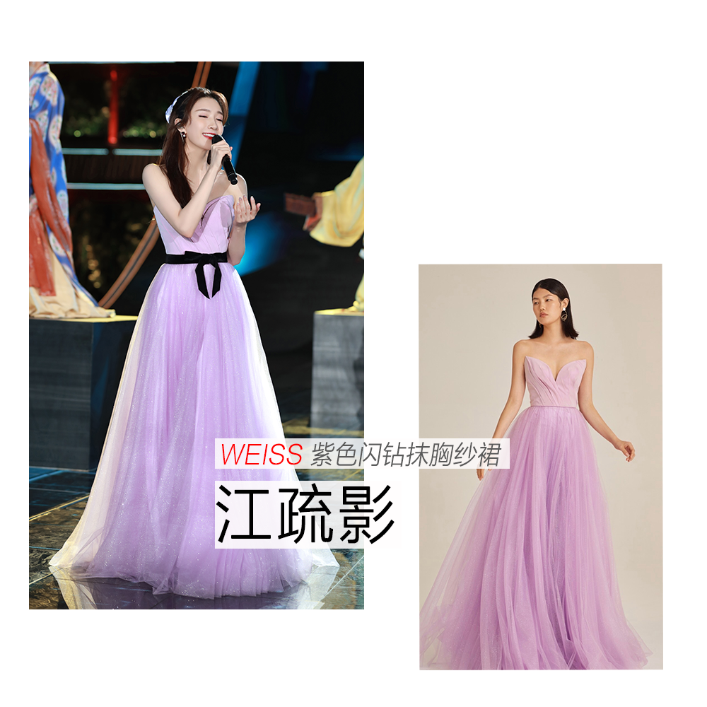 看惯了江疏影的职场女强人造型,这一次的纱裙太“二十不惑”了吧?抹胸礼服将极富梦幻浪漫色彩的紫色和轻易而灵动的薄纱进行碰撞,打造出清雅温柔的少女风。伞状的裙摆以及腰部黑色蝴蝶结腰带,这种一张一弛的设计,不仅修饰身材曲线,还能在视觉效果上增加柔美感,完美演绎了简约大气的着装也能穿出低调雅致的情调。