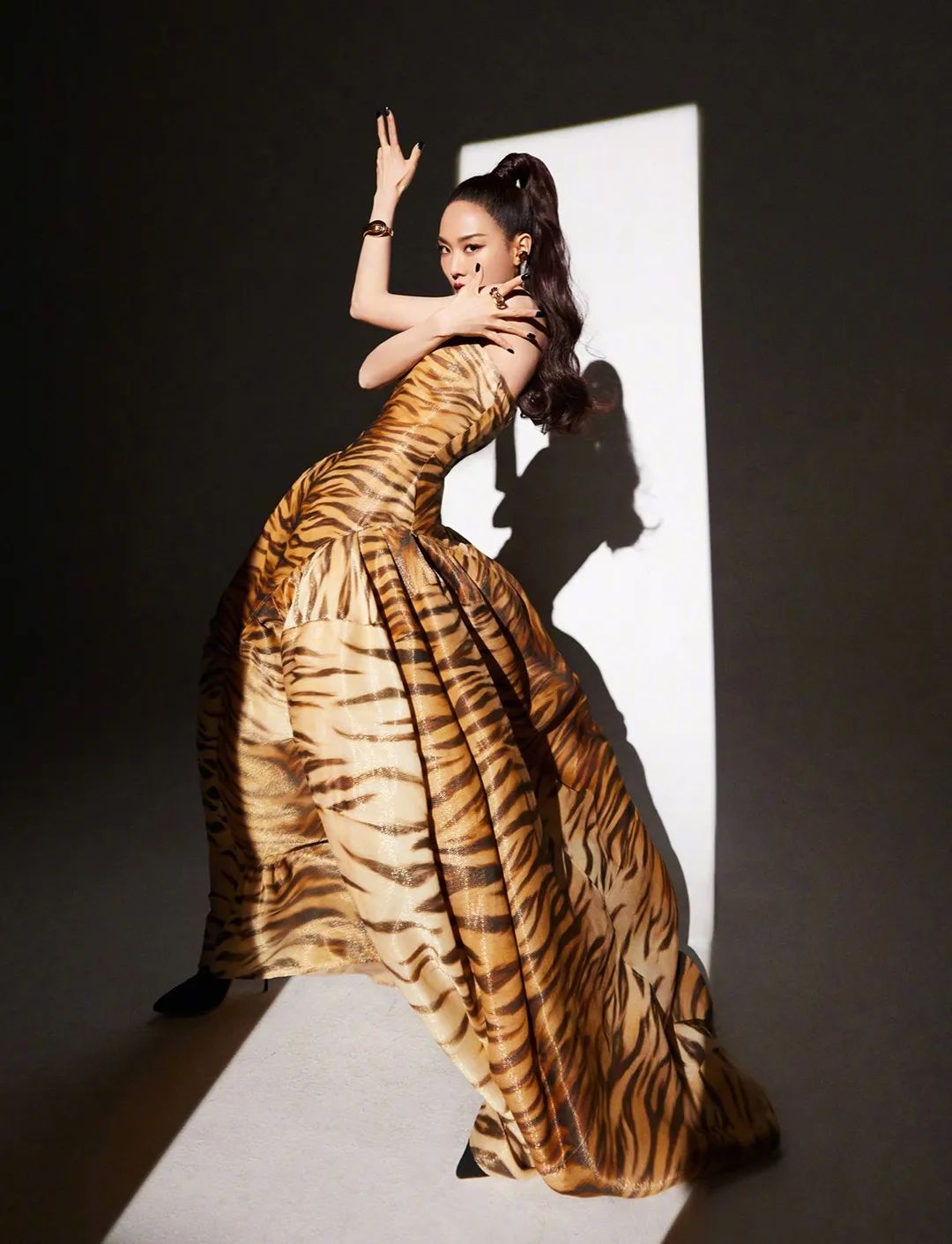 在灯光的照耀下,仿佛散发着猛虎皮毛般的光泽。抹胸、收腰加上大裙摆的设计中和了虎纹的狂野。