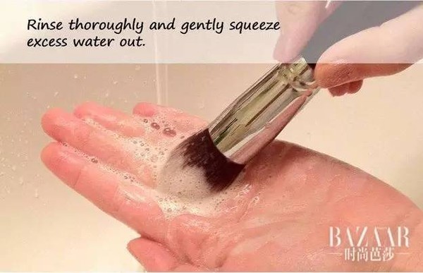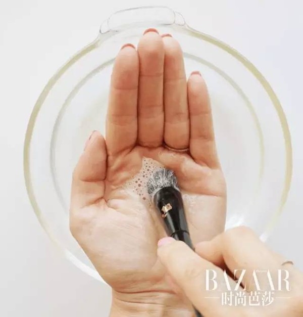 step3 将刷子在手掌轻柔打圈按摩出沫,同时用小股温水冲洗刷毛。