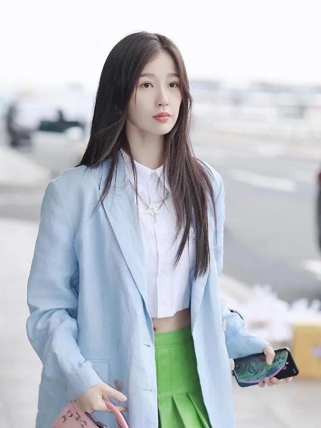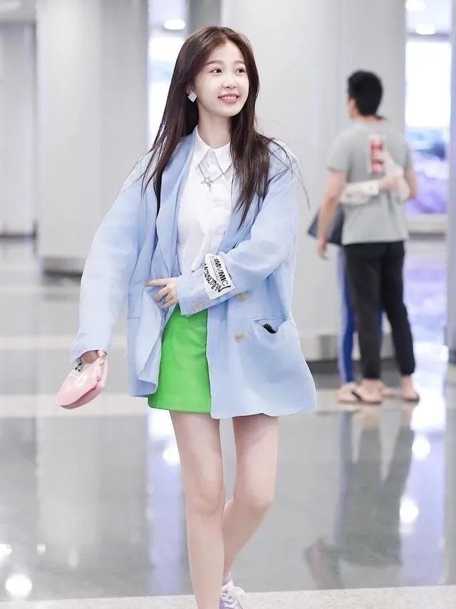 欣欣子短款白衬衫外搭了一件浅蓝色休闲西装,一条果绿色的百褶短裙最为亮眼,今天也是一个充满活力的元气女孩!