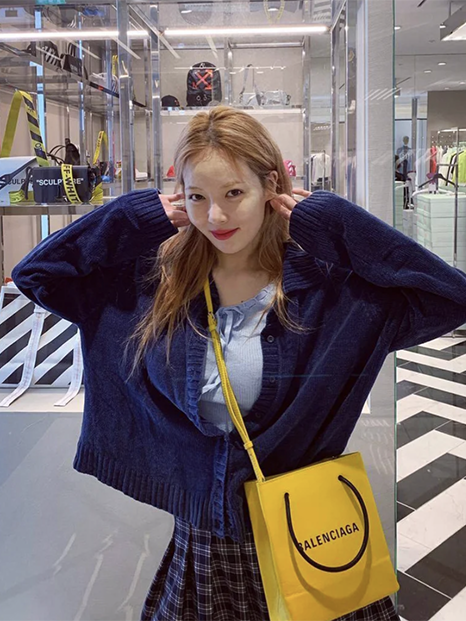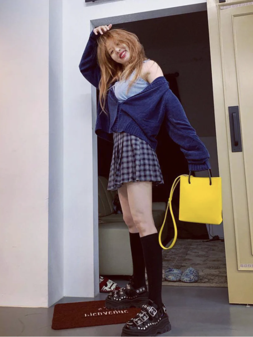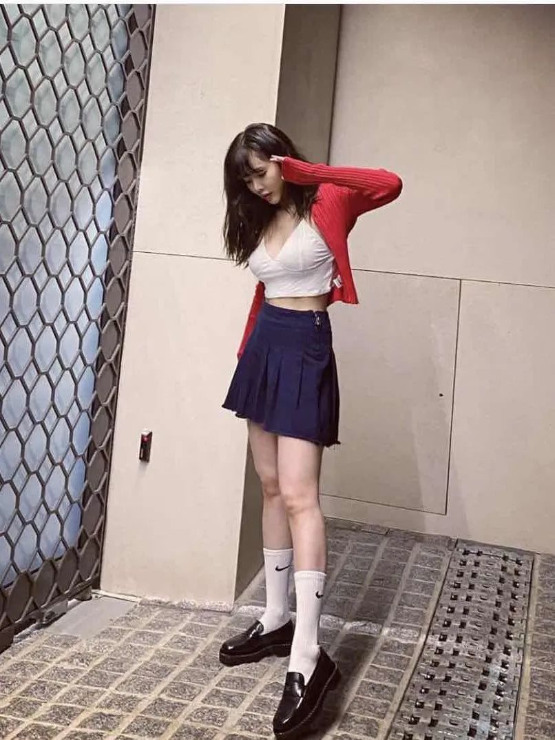 泫雅这次妥妥的化身成了学院少女,用Crop top配起超短裙,小皮鞋配上高长袜,虽然看起来是乖乖少女的模样,但是在搭配中还是用红、蓝两大块做出了对比色,给人强有力的视觉冲击。