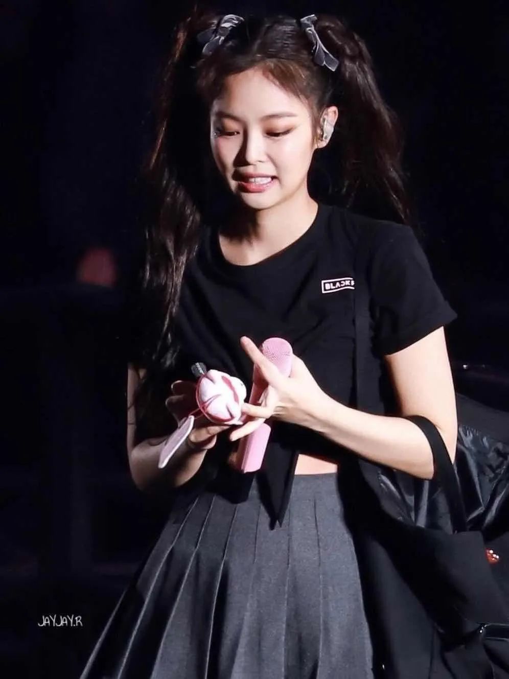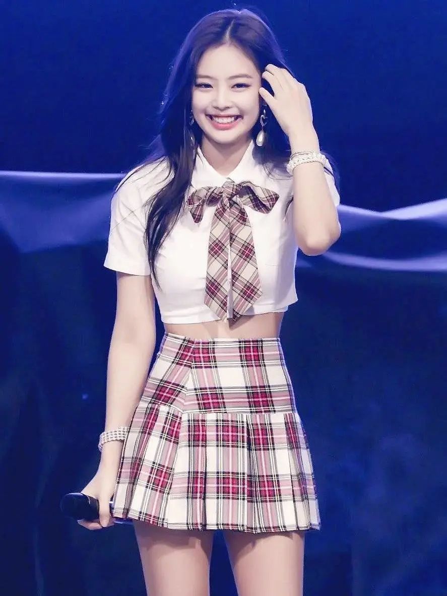 Jennie的短裙装Look每次一出场都给人留下甜酷女孩的标准印象,搭配起短短的Crop top就有这种又甜又辣的感觉。