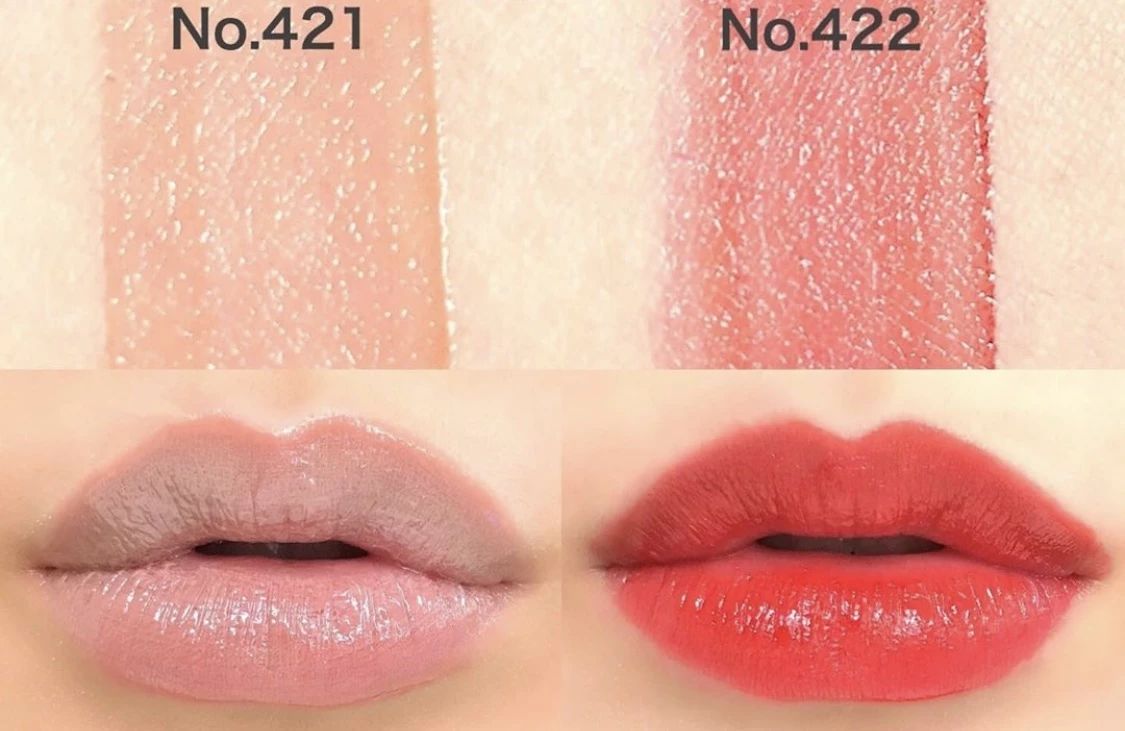 还有黑管唇釉,No.421是更清透一点的裸米色,而No.422属于偏橘调的西瓜红,很显元气哦!