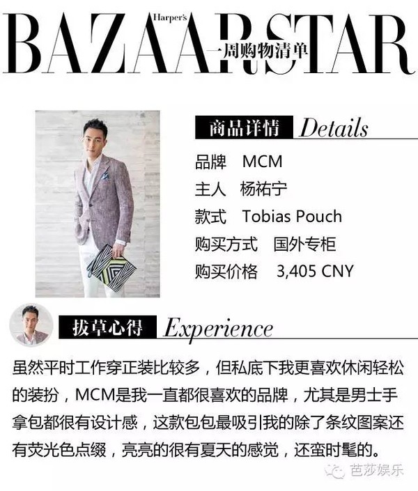 别看杨祐宁在屏幕上塑造了很多成熟稳重的角色,其实他内心住着的是个爱运动也爱时尚的青春大男孩,还特别喜欢MCM这种潮牌!手拿包这种本来就够时髦的单品也要选择有条纹跟荧光色点缀的样式,祐宁boy要不要这么会买啊!