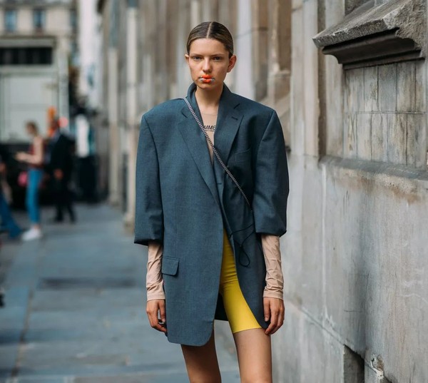 你看,这不。搭上oversize的西装外套感觉就完全不一样了。或许你会说了,那我搭配别的裤子、裙子不行?非你这单车短裤不可?