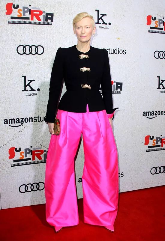 带着古一法师一角回归的Tilda让粉丝在锅里炸得里焦外嫩。玩够了行为艺术的女王出场就用芭比粉来打招呼,这裤型像扎了个马步,到凡人胸前那么高。