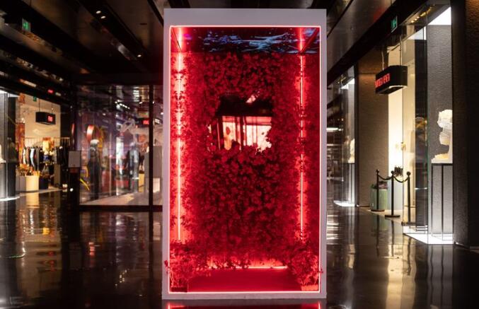 限时空间将“FREEDOM IN FLOW”的概念引入到空间设计中,以红色为基调,特别打造一个沉浸式艺术 空间。将权志龙的个人风格及理念用红毯,雏菊及舞台等元素进行了诠释。巧妙运用镜面反射的墙体,使 权志龙恣意舞蹈的画面无限延伸。特别打造的红色雏菊从地面及天空向舞台中心努力生长,表达了追求自 由的意志,成片的花朵向外蔓延,传递对艺术无边界的追求,同时鼓励大家打破边界,追求自由。