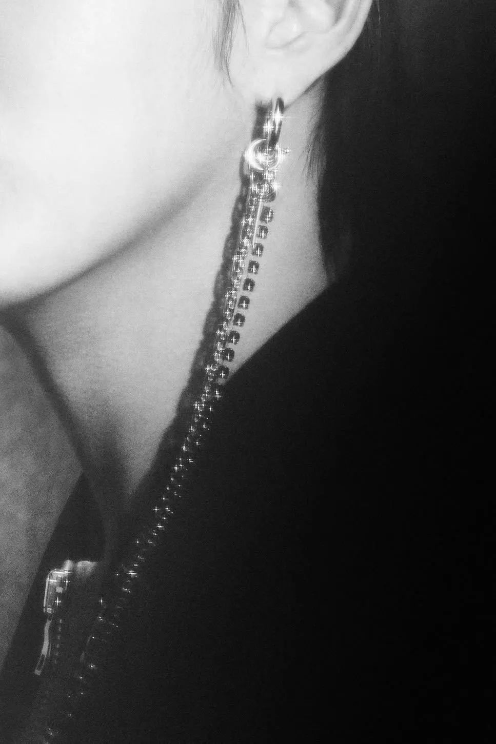 细品下来,可以在这种既朦胧、又黑白的照片中让造型“突出重围”,还真少不了这条流苏水钻耳环的功劳。
