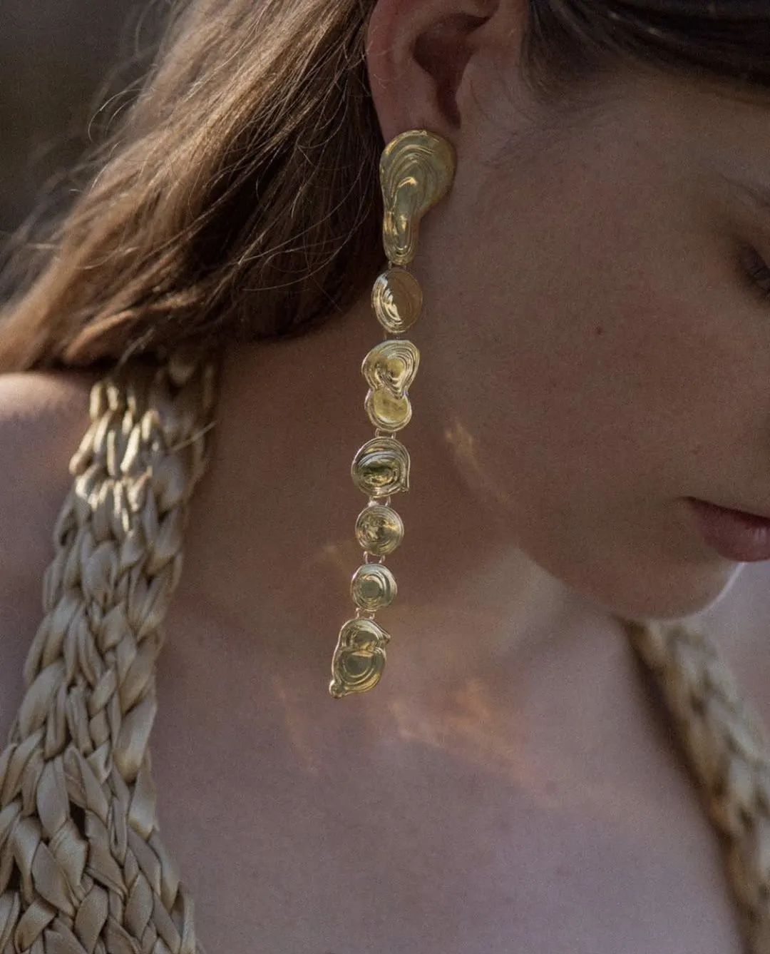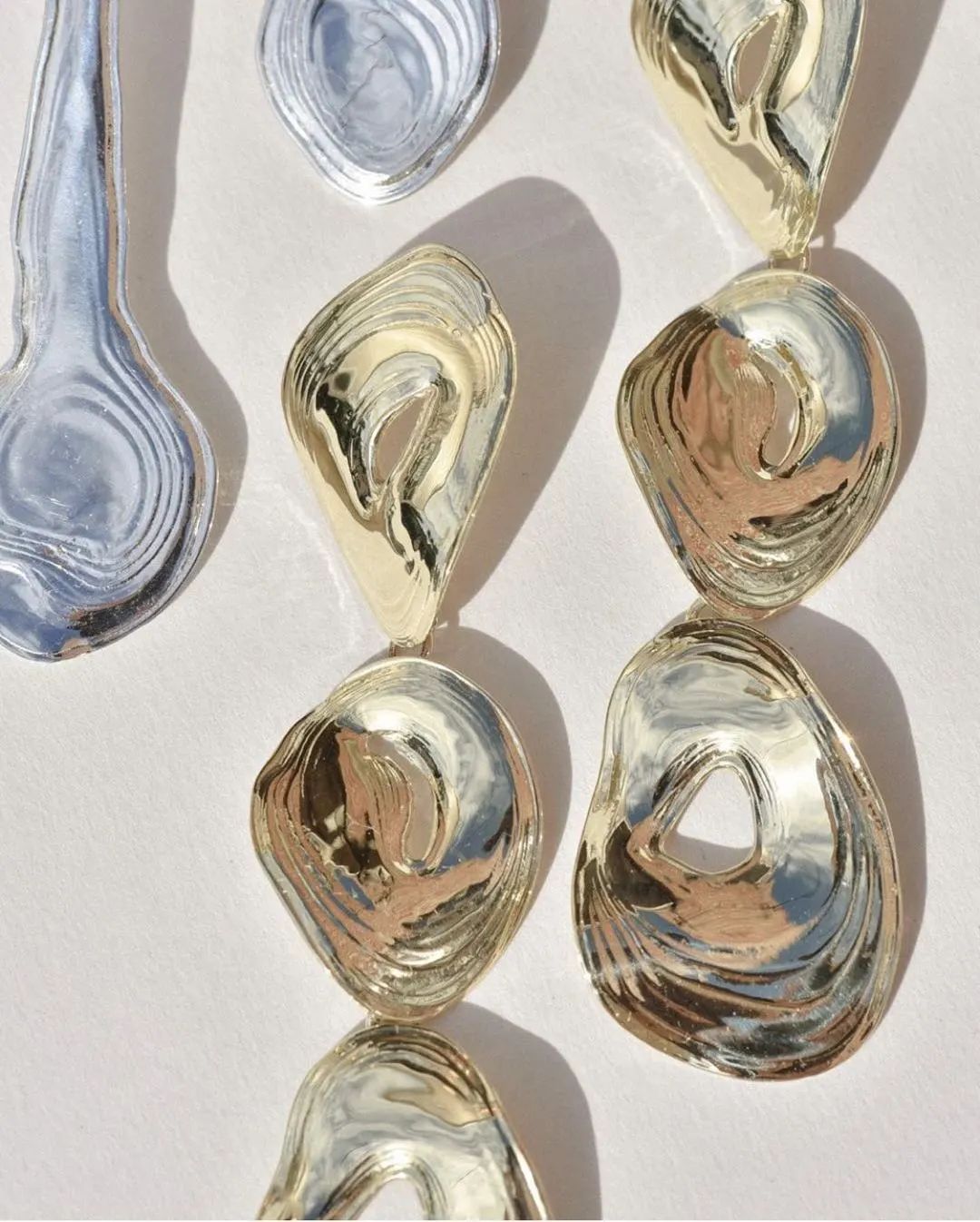 品牌以大自然和建筑为灵感来源,在它设计的每款耳饰上,都充满了立体的流动性,像是坠入凡间的星辰陨石、冷却过后的熔岩漩涡。