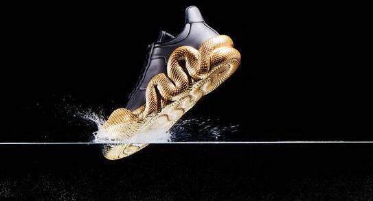 和最初的造型一样,符合人体工学、梦幻般的低帮运动鞋盘绕有一条3D立体眼镜蛇,蛇头在鞋头处傲然抬首,神情诡秘。然而,2022年秋季推出的新款并不止步于此:蛇身覆以亮滑金色光泽。
