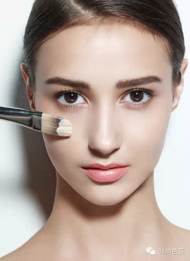 1.两边眉肱骨、鼻翼三角区、嘴角下方,用接近肤色的粉底用刷子分别涂抹