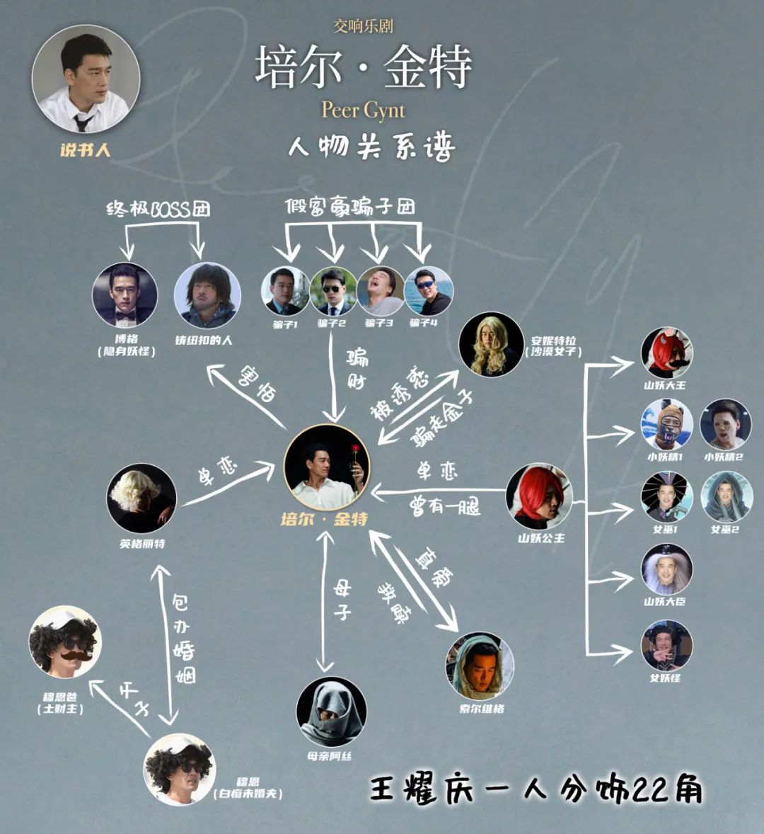 在这部《培尔·金特》里,作为剧中唯一的读剧演员,王耀庆要在两个多小时的演出中,呈现22种不同的角色。