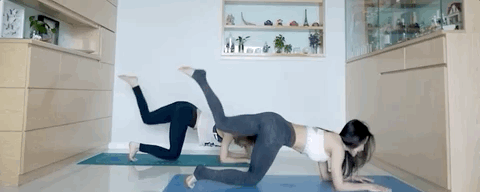 STEP 5:半跪在瑜伽垫上,双手打开与肩同宽,慢慢抬起右脚向后上方踢腿,然后屈膝向前,做20次;