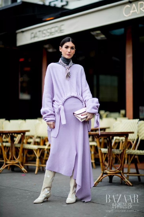 如果觉得这种穿法太保守,可以学习时尚博主Caroline Daur,用复古风的上衣搭配复古风的同色下衣,在颜色呼应的同时,更能调动出高领自带的华丽气息。