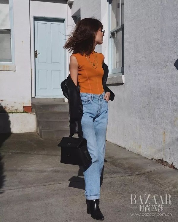 就拿复古风的高领上衣来讲,一两种复古元素融合在一起,造型感就已经很强,所以下半身不用穿得太累赘,搭配一条简单的牛仔裤就能轻轻松松帮你赚足回头率。
