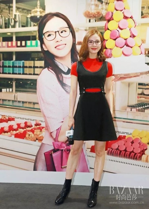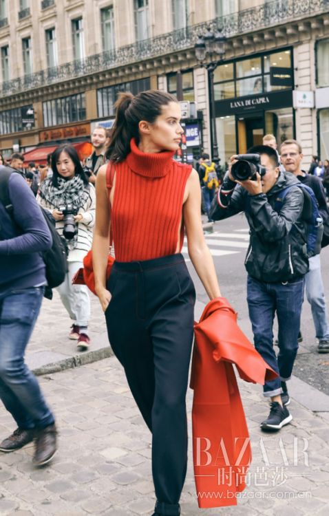 或者利用深色的背带裙、裤与彩色高领上衣叠搭也可以,更能在很大程度上起到收紧上身的作用,哪怕是膨胀度仅次于白色的大红色也没在怕的。