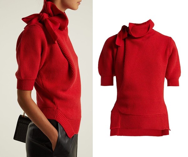 而且你知道吗?这些设计还能助你弥补身材上的不足。比如如果你的脖子本身没有那么修长,除了像之前说过的选择半高领或者把头发扎起来,其实还可以选择蓬松的荷叶边领,通过若隐若现的露肤,在视觉上延长脖子线条。