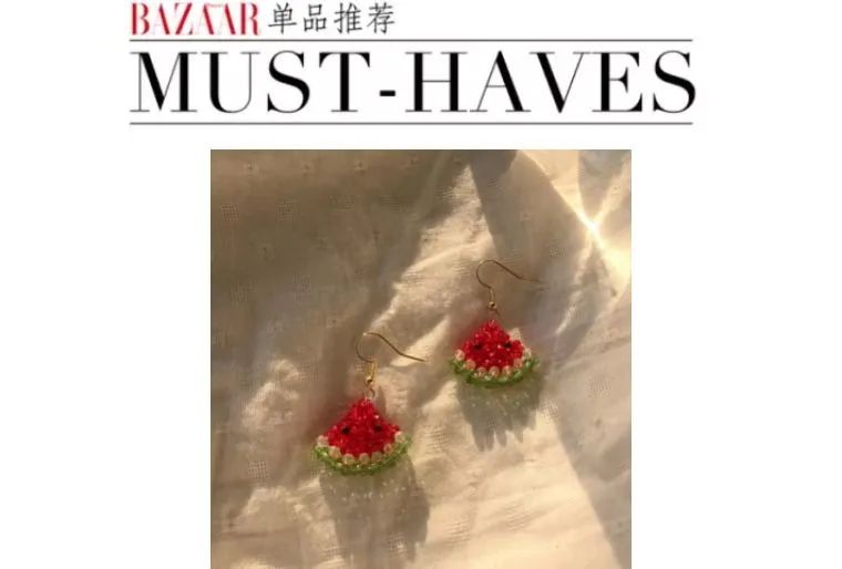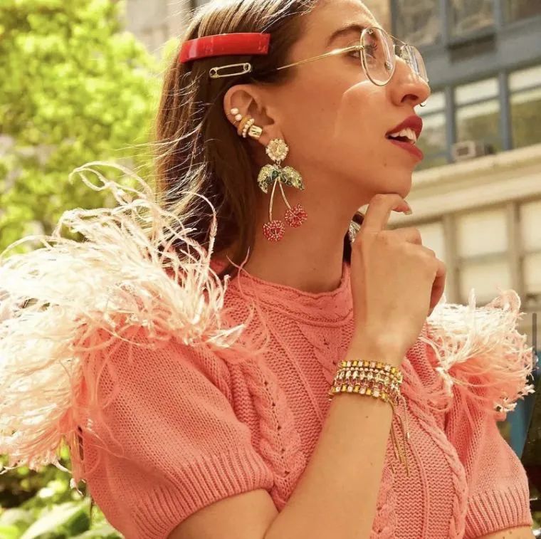 鲜艳的耳环随便搭一件白Tee或纯色连衣裙就可以很好看,叠加戴一连串水果耳环和配饰也不会显得累赘,更是一抹热带风情哦~