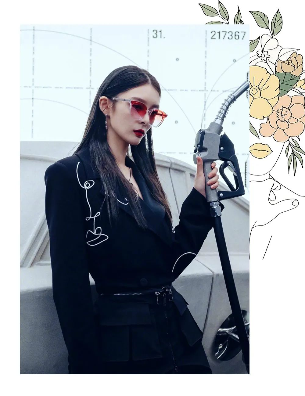 Moschino在2020早春系列中延续了它一贯的drama和天马行空,但傅菁上身的这件西装外套却张扬中带着克制,经典的西装版型加以白色线条人脸抽象画,充满了艺术感。绝的是,傅菁用一条工装裙作为内搭毫无破绽,金属拉链衔接得天衣无缝。