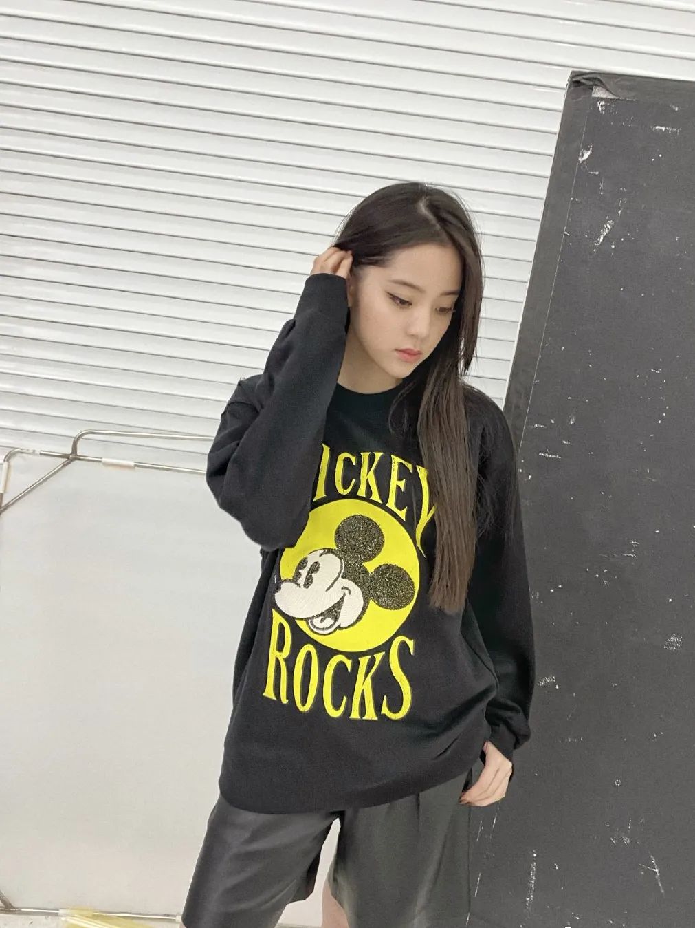 Mickey头像运用了贴亮片+刺绣的方式,使得这个图案超立体有型,穿上身就是闪闪发光的女孩,娜比用它和一条短裤做搭配,今日份的酷酷女孩已经上线!