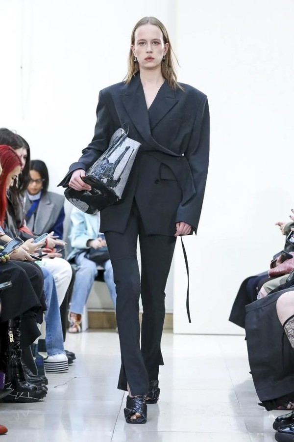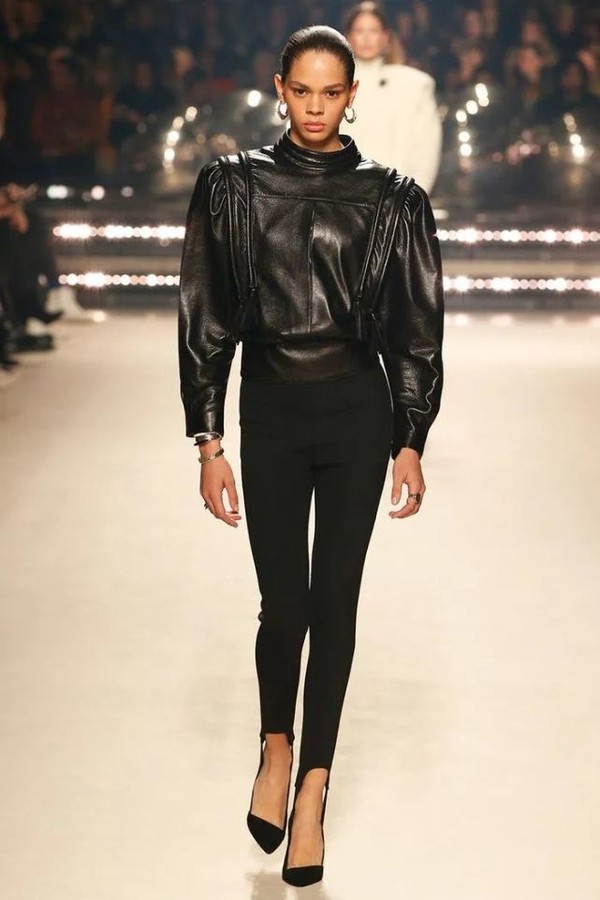 Isabel Marant在2020秋冬的秀场上也把它作为不同Oversize上衣的主要搭配单品,裤脚的弧形设计从视觉上拉长了脚背长度,一条简单的黑色裤子就这样成为了穿搭中的主角。