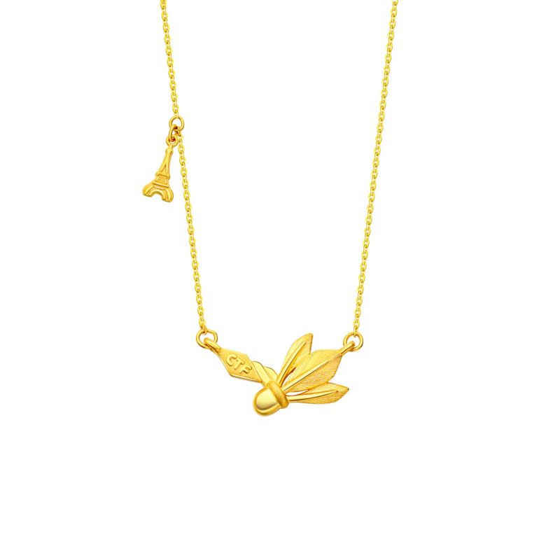 倾斜的羽毛球及小巧的巴黎铁塔吊坠,在造型和分布上显得活泼有趣。羽毛部分以特色拉丝表面工艺及层迭效果实现独特立体造型和细致质感,透过精细的工艺技巧展现黄金的可塑性。