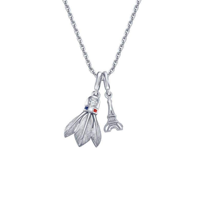 双吊坠设计结合法国国旗、巴黎铁塔、羽球三大元素,造型精致的羽毛球以高低层叠的羽毛营造出立体感和丰富层次,并以特色拉丝表面工艺表现出真实羽毛的质感。 中央主石采用包边镶法,巧妙呈现羽毛球头的圆拱形状态;下方则以鎏彩工艺呈现法国国旗的蓝、白、红三色,同时展示法国地标、奥运竞赛地点及项目。