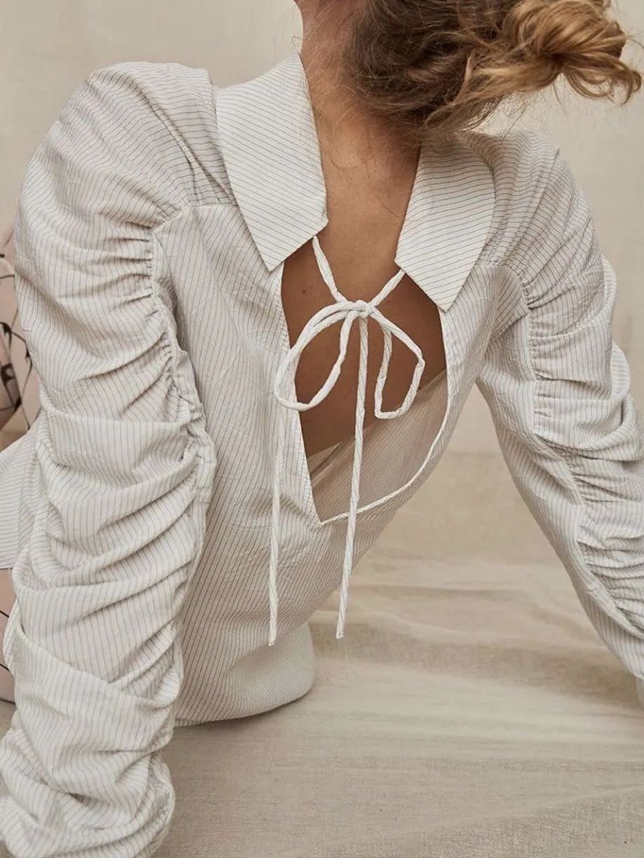 Stine Goya还对工装衬衫进行了复刻,两个超大的补丁口袋展现了工装的刚硬气息,而腰部系带则起到强调身形的作用,将率性和柔美的分寸感平衡得很好。