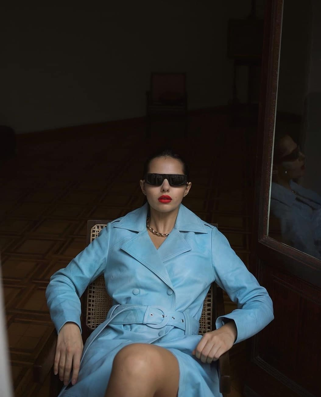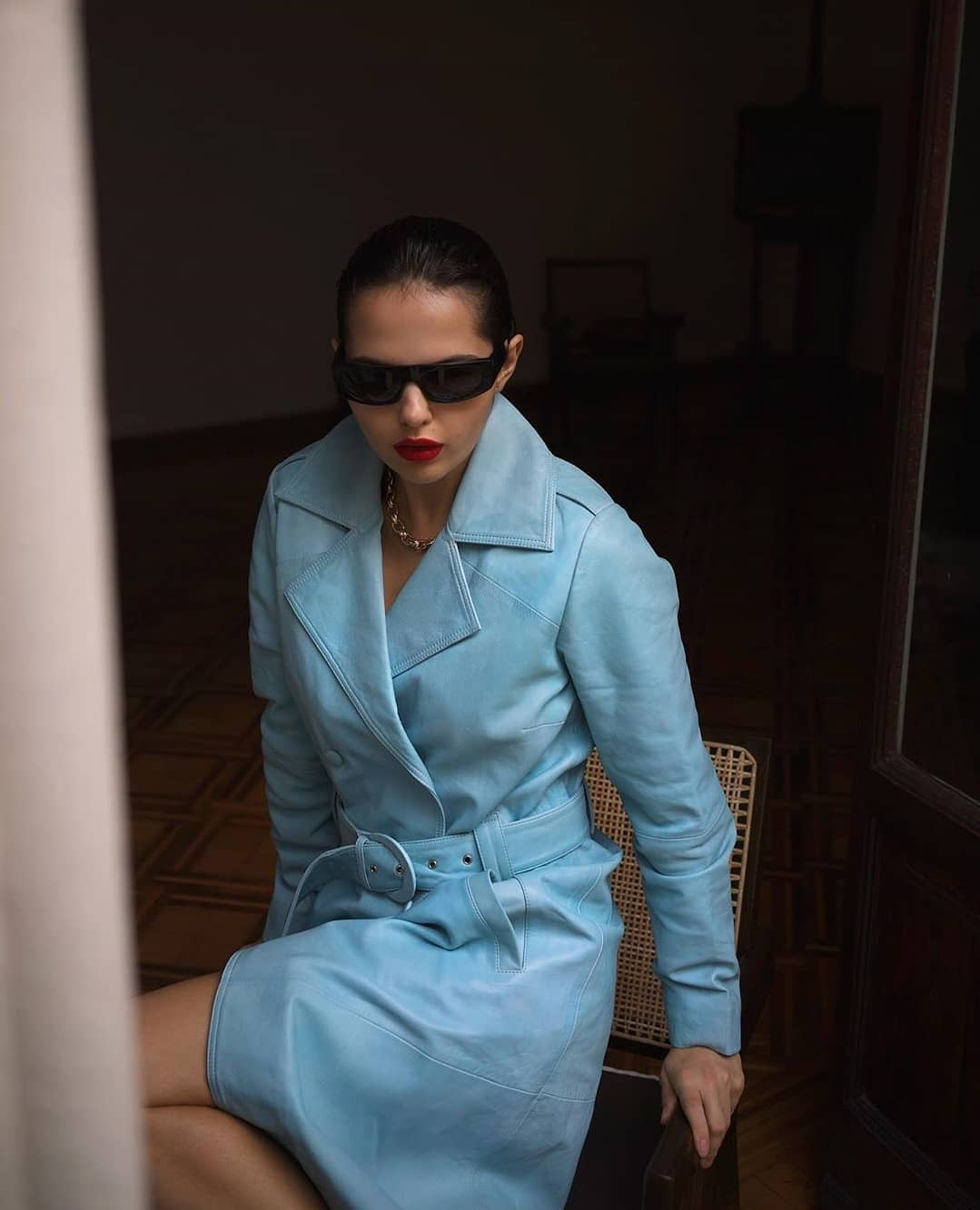 天蓝的配色,带给大家耳目一新的视觉冲击力,还可以用红唇和墨镜为大衣加成,气场两米不是问题,时尚博主Doina也太会了!