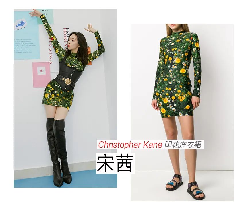 Christopher Kane的印花从来不会让人失望,缀满雏菊的草地在大家眼中幻化成了绿野仙踪的仙境。宋茜给这一番美景加上了皮革束胸衣的装饰,配上过膝靴立刻“野”了起来。