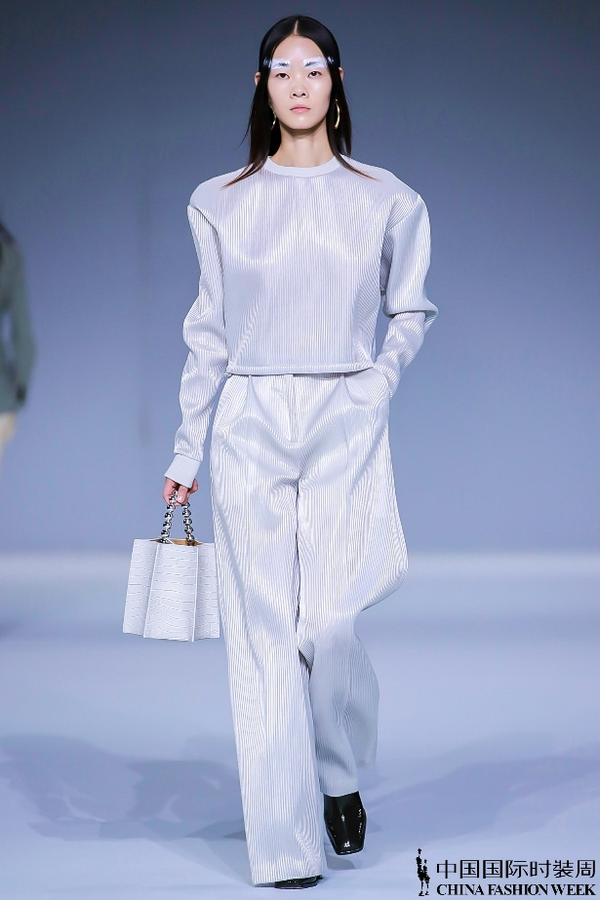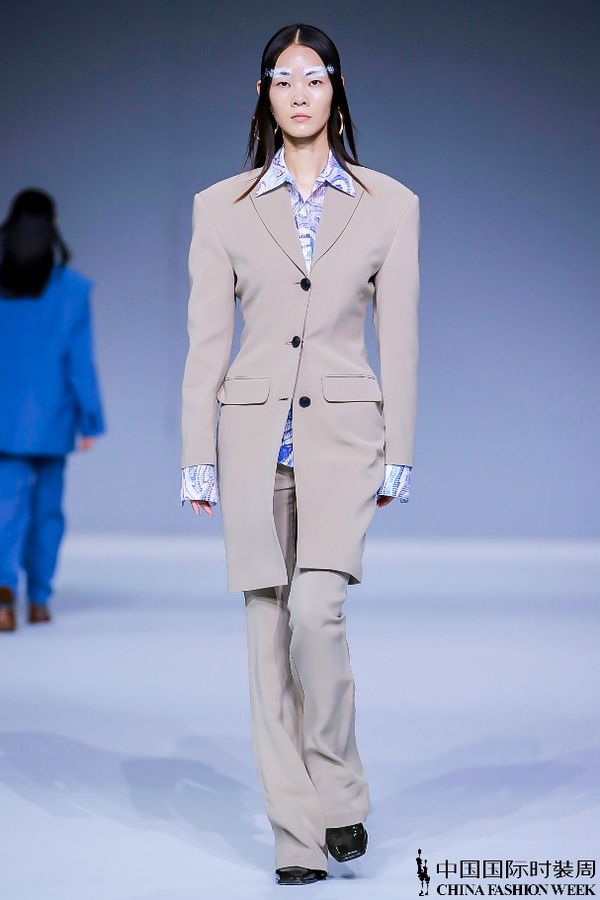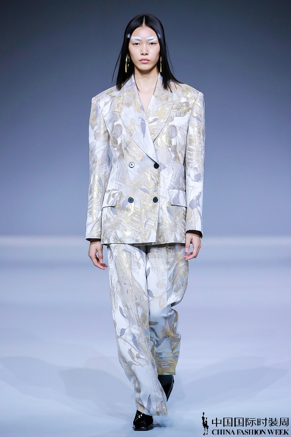 2021春夏系列由超模刘冰冰、王新宇等人领衔演绎,唤醒大家对上个世纪武侠年代的视觉回忆。此外,2020龙腾精英超级模特大赛的冠亚季军以及2020IMC上海国际模特大赛的冠军等新面孔都有出色的发挥,秀场上鱼贯而出的宽大肩部线条下收紧腰线的total look,各种融合当代基因的复古印花的衬衣和oversized西装套装层次利落地搭配,放大了武侠年代的特征,设计师韩磊再次运用了创新材质堆叠和混搭造型,意在营造出两个时代的经典特质。
