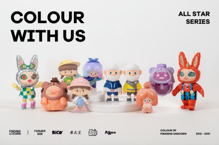 秉承“发现艺术之美,引领艺术潮流”的品牌理念,此次发行的Colour With Us全明星系列盲盒希望以“追逐不定义的未来之色”为设计内核,鼓励玩家突破重重藩篱、勇敢悦己表达。以2012年的橘子探戈为伊始,到2013年浸润于翡翠色的迷幻夜中,再到2014年隐紫色的纠葛前行,2015年陷落玛莎拉的沉醉梦境中,2016年与自然的粉与蓝共行,2017年以童心拥抱草色摇曳,2018年以紫外光照亮想象,2019年用珊瑚橘打开微笑,2020年以蓝色让经典不朽,2021年感知交织希望的黄与灰......融合每个IP独特的设计理念,超越颜色本身,寻找独角兽希望以色彩的巧妙组合与极富想象力的设计语言给予观者触动心灵的力量。正如寻找独角兽希望透过此次发售所传递的——回溯过往,每种人生的底色都会因为不同的经历和体验焕发出属于自己的闪光。