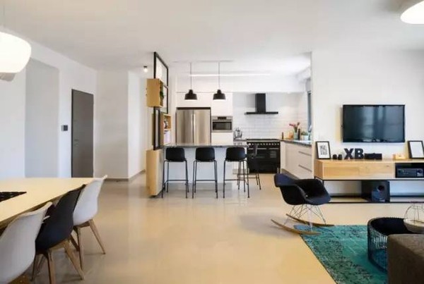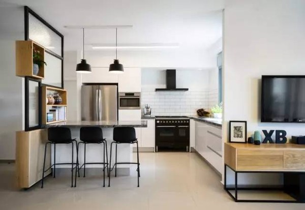 厨房被大修,以避免形成一片白色的海洋,选择黑色的烤箱和烟罩是用来对比白色的橱柜和墙壁,黑色凳子和呼应的吊灯更好地凝聚了空间