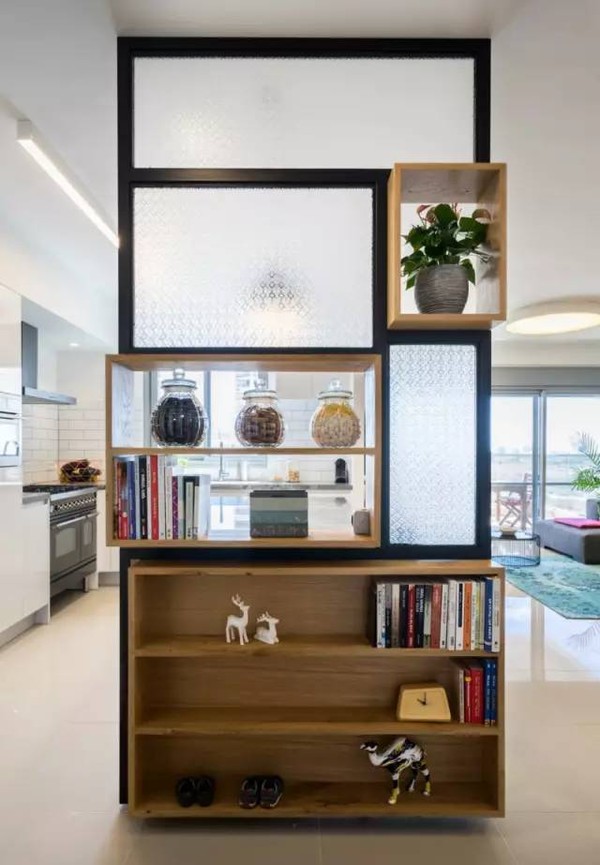 最初公寓在入口、主卧室和厨房之间没有任何分隔,因此,他们决定建造一个包含搁架的分隔架用于额外的储存,玻璃的目的是仍然允许光通过