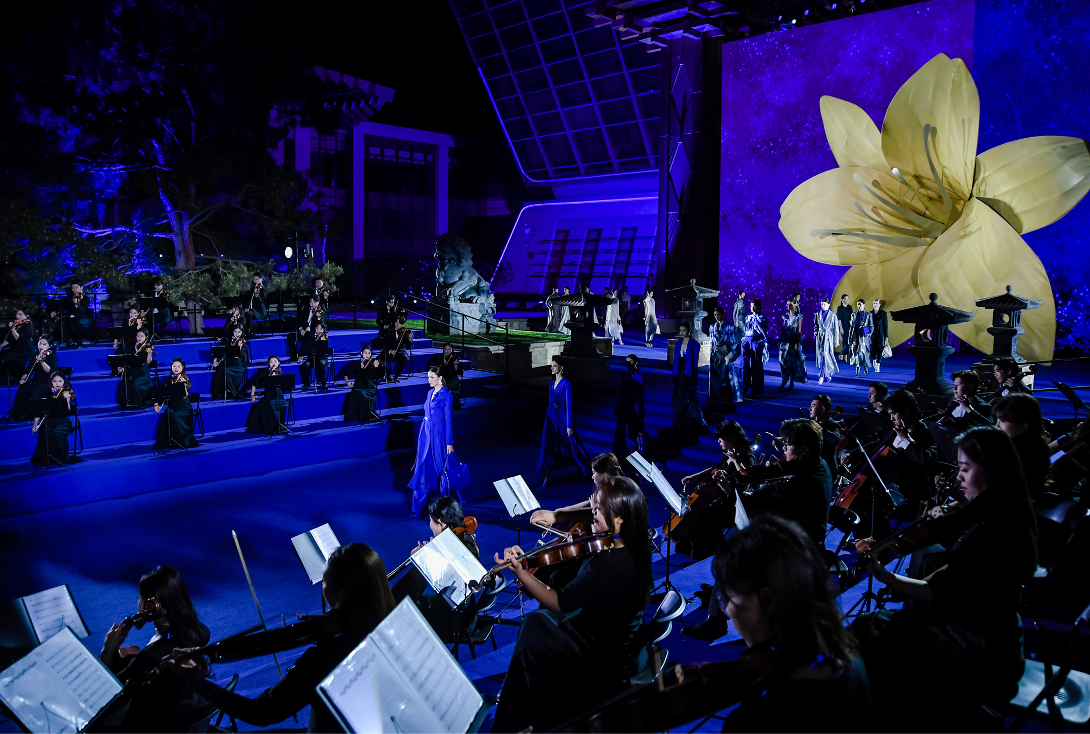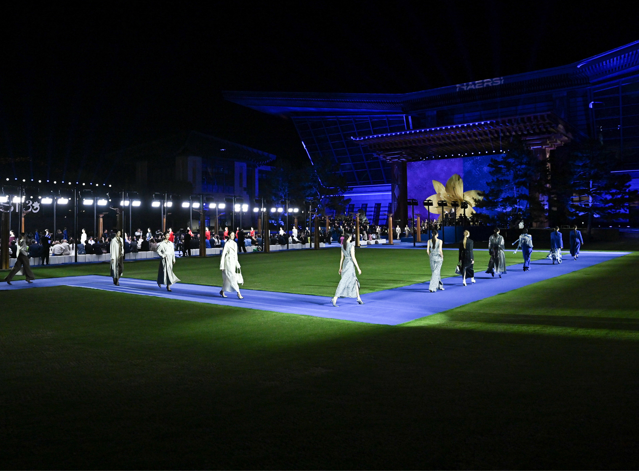 秀场设计以“加冕礼”为核心,选址于世界级峰会的国际会都——北京雁栖湖国际会议中心上演,时尚与自然、人文艺术在此交织加冕盛宴。NAERSI标志性25°蓝渲染夔龙纹迎宾道,象征通往荣耀的加冕之路。秀道中央百合艺术装置匠艺盛绽,为女性献上优雅冠冕。曾创编百余部国际大型音乐会作品的著名作曲家李勋先生受邀作为大秀音乐总监,以交响乐团奏响典雅乐章,与立体光影秀形成视听共振,营造出古典歌剧院般的典雅氛围,模特们身着优雅臻装从容缓步,经典与创新在同一空间碰撞、交融,绽放内蕴女性优雅精神的时装风尚。